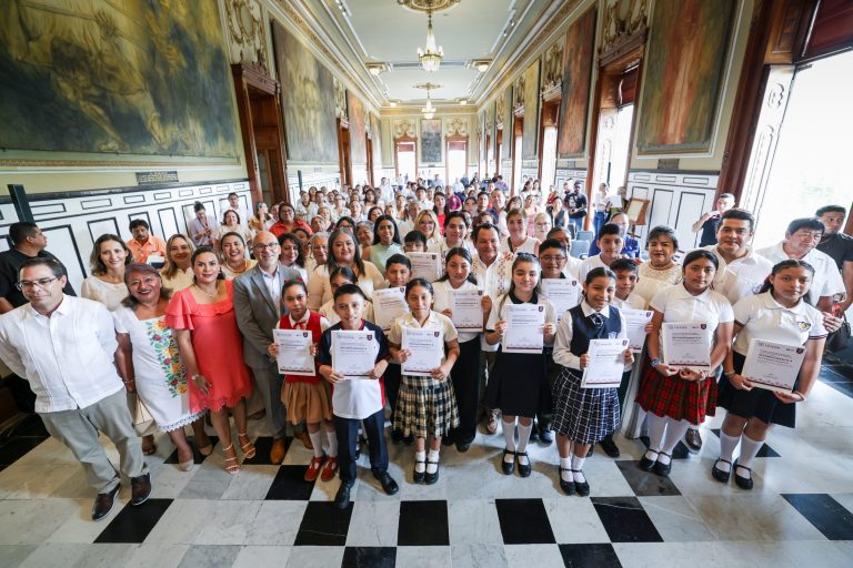 Mérida, Yucatán, a 8 de julio de 2025.- El Gobierno del Renacimiento Maya reconoció a 14 estudiantes de sexto grado...