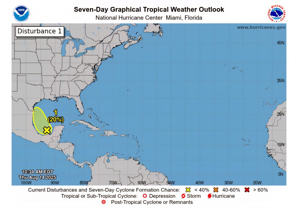 El Centro Nacional de Huracanes de Estados Unidos indica que sigue produciendo aguaceros, tormentas desorganizadas y tormentas eléctricas, pero en el Golfo de México las condiciones ambientales son marginalmente propicias para un mayor desarrollo.