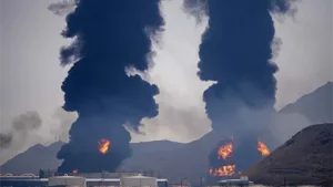 Alexander Drozdenko, gobernador de la región de Leningrado, al norte de Moscú, señaló que allí se derribaron 56 drones, y que se produjo un incendio en el puerto del mar Báltico de Ust-Luga como resultado del ataque de Ucrania.