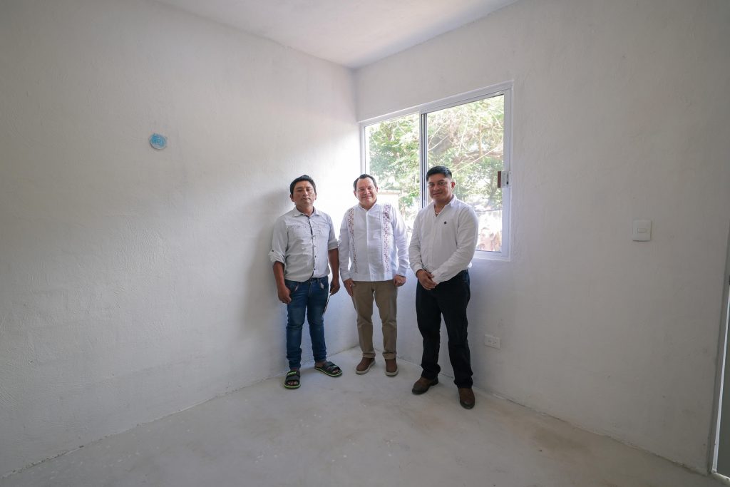 En presencia del presidente municipal de Yaxkukul, Carlos Jesús Uc Pech, el Gobernador destacó que estos cuartos representan una mejora al patrimonio familiar, al brindar seguridad y esperanza de que las nuevas habitaciones se traduzcan en un techo seguro y en justicia social, y reiteró que las familias yucatecas no están solas.