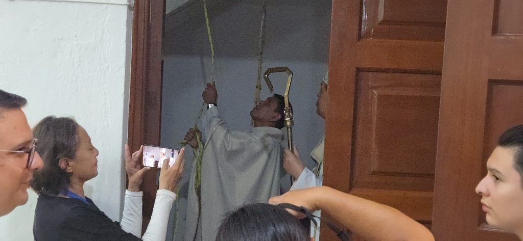 Antes de dar inicio a la Santa Misa, el arzobispo invitó al padre Edwin a tocar las campanas del templo, un gesto simbólico que convoca al pueblo de Dios y marca el inicio de su misión pastoral como guía de esta comunidad.