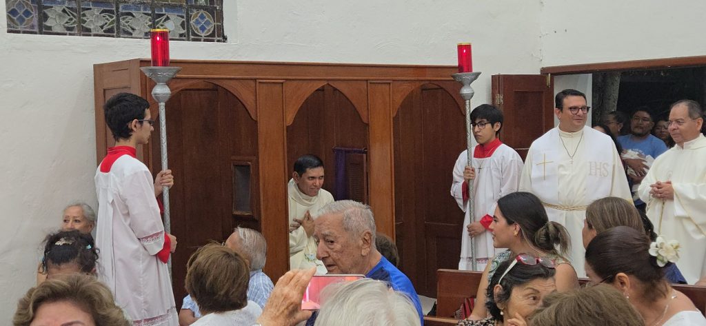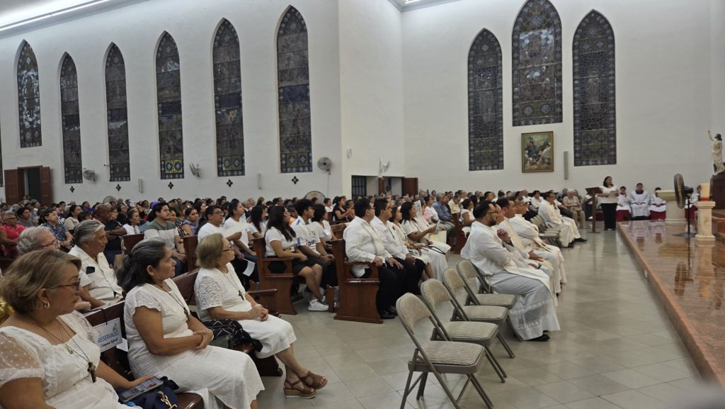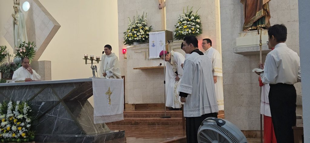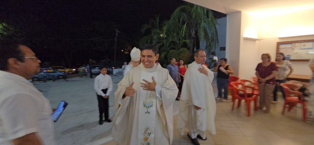 Mérida, Yucatán a 27 de agosto de 2025.- Con profunda emoción y espíritu de fe, la comunidad católica de Nuestra Señora del Rosario de Fátima recibió a su nuevo párroco, el presbítero Edwin Beltrán Pereira, en una solemne celebración eucarística presidida por el arzobispo de Yucatán, Mons. Gustavo Rodríguez Vega, acompañado de sacerdotes de distintas parroquias de la Arquidiócesis.