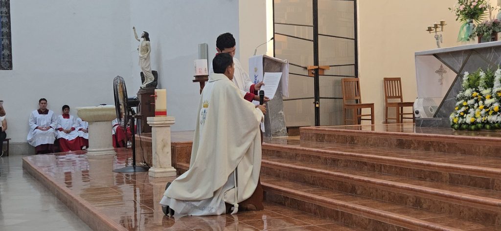 Con voz emocionada, el padre Edwin compartió su testimonio vocacional, recordando que un 13 de mayo recibió el acolitado y lectorado, y un 25 de agosto, como hoy, el diaconado transitorio. Agradeció a Dios por su llamado, a su familia por el apoyo incondicional, y a sus anteriores comunidades parroquiales: Santa María Goretti y la rectoría de San Pedro y San Pablo, presentes en la celebración.